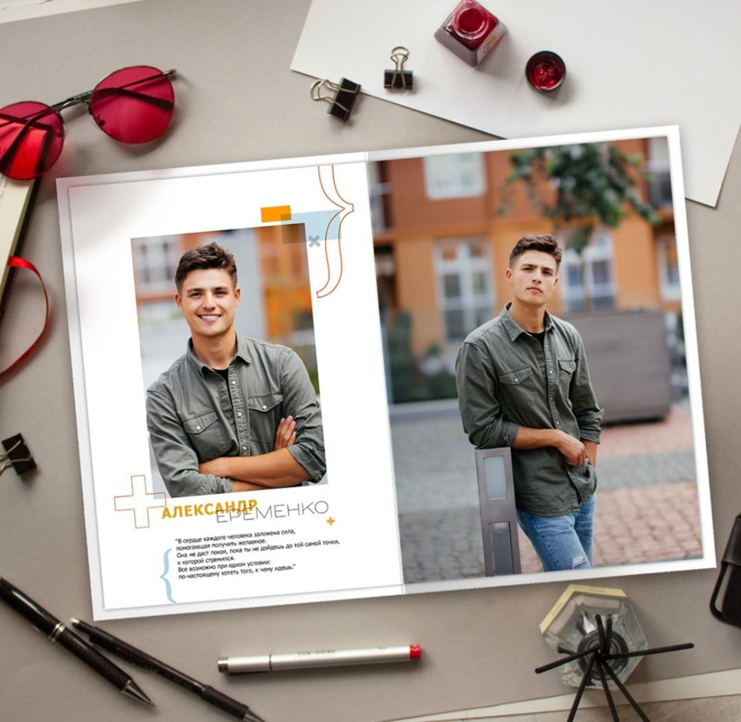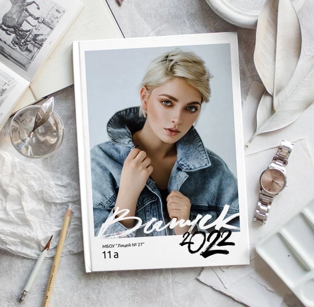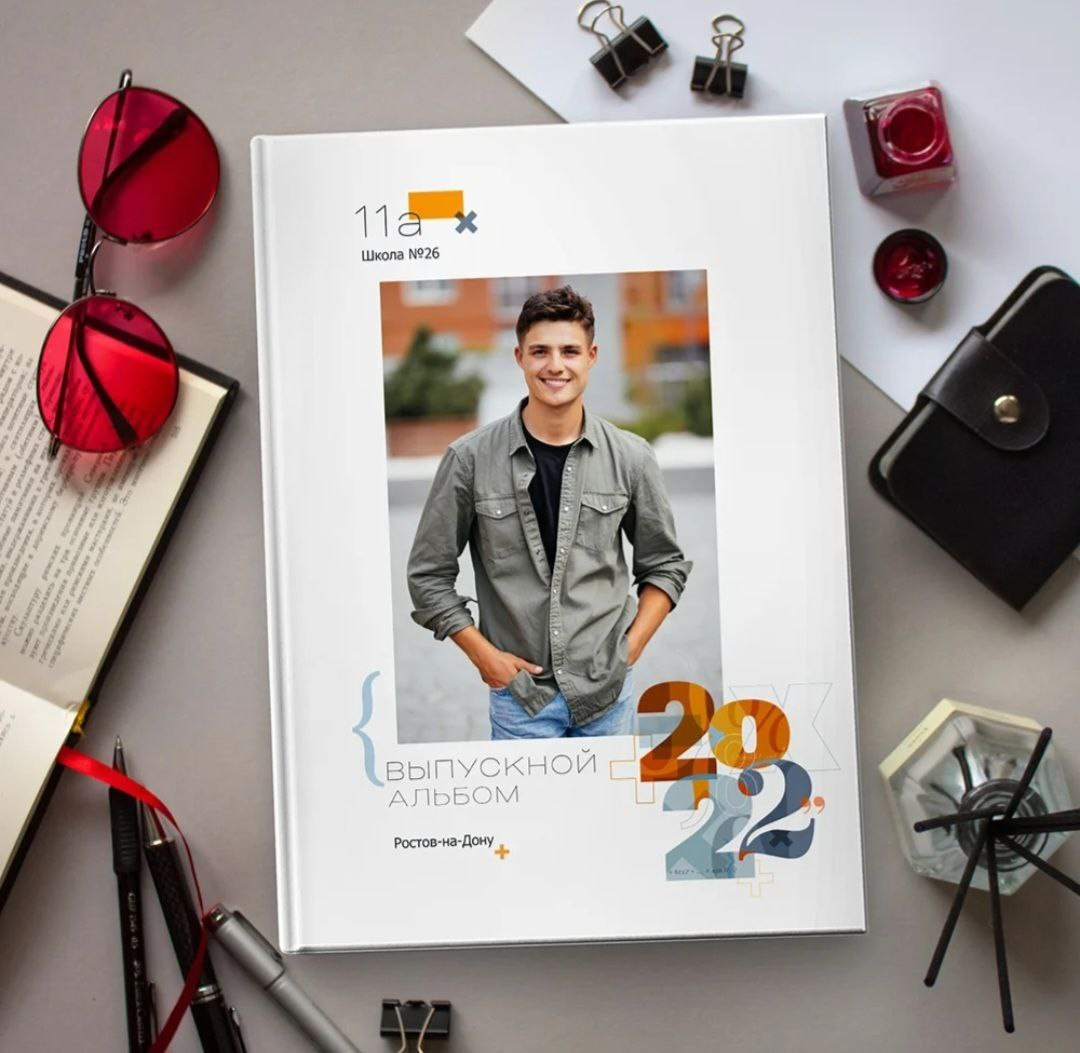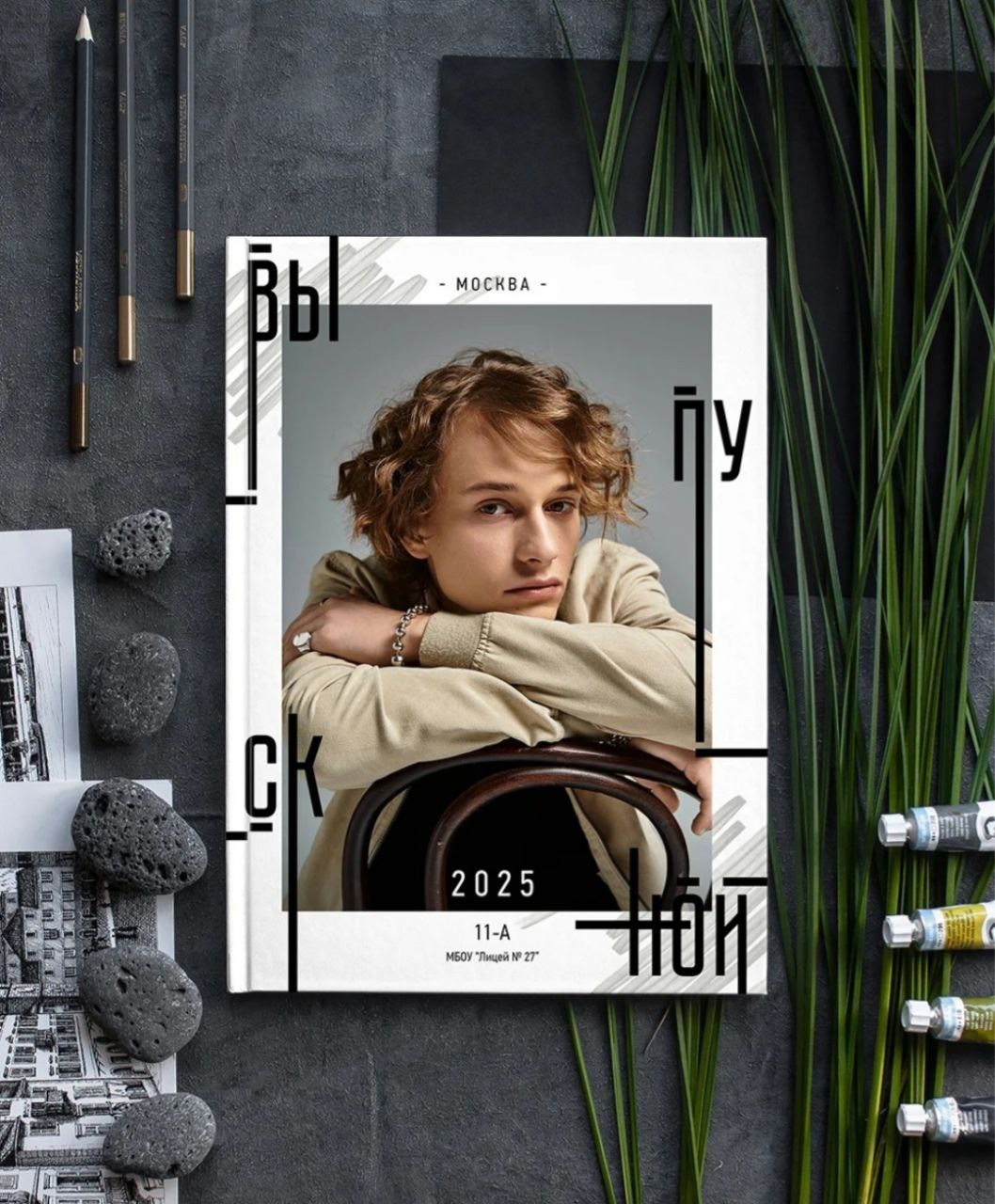 - 2 индивидуальных фото выпускника (одно на виньетке, второе на обложке)