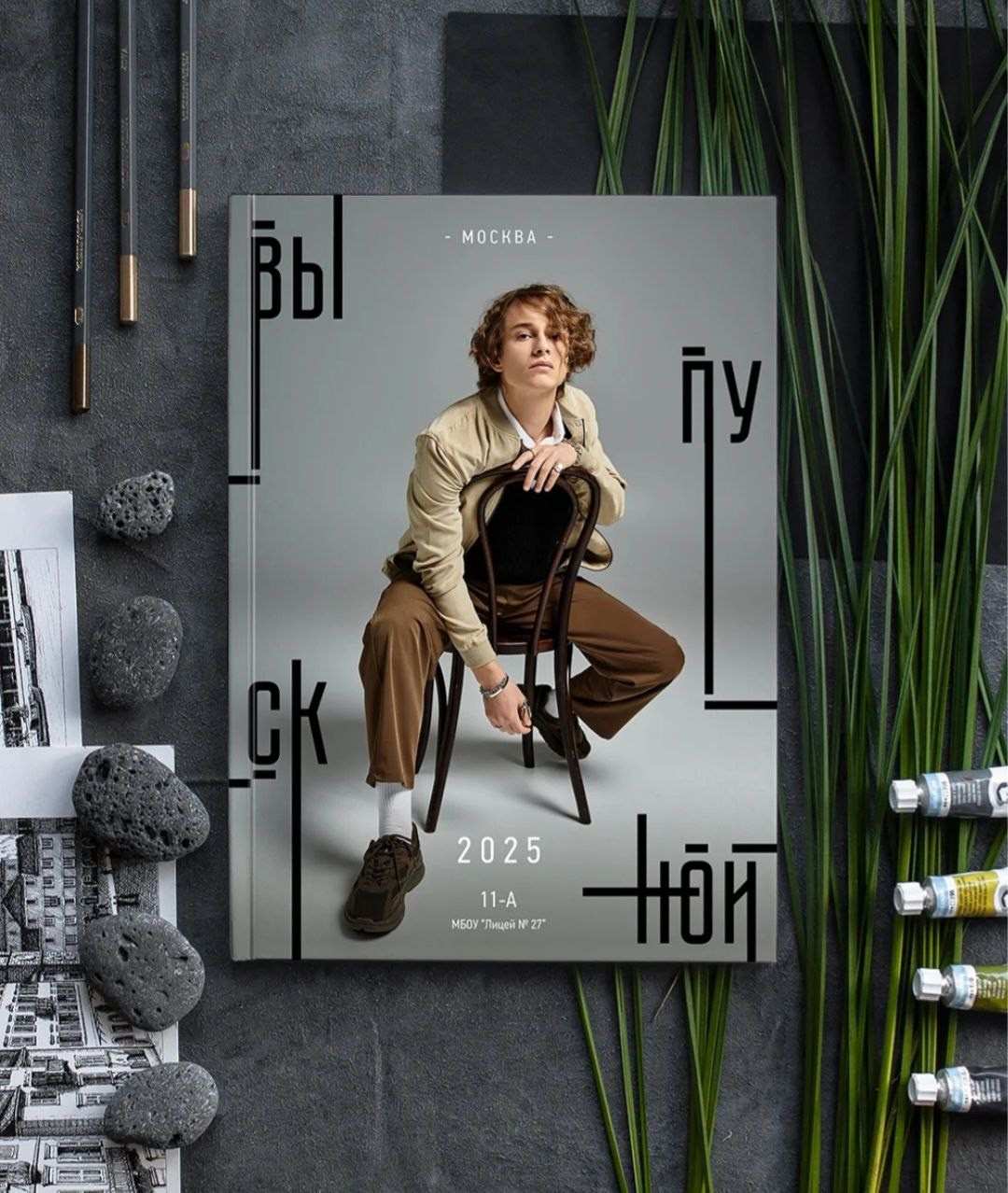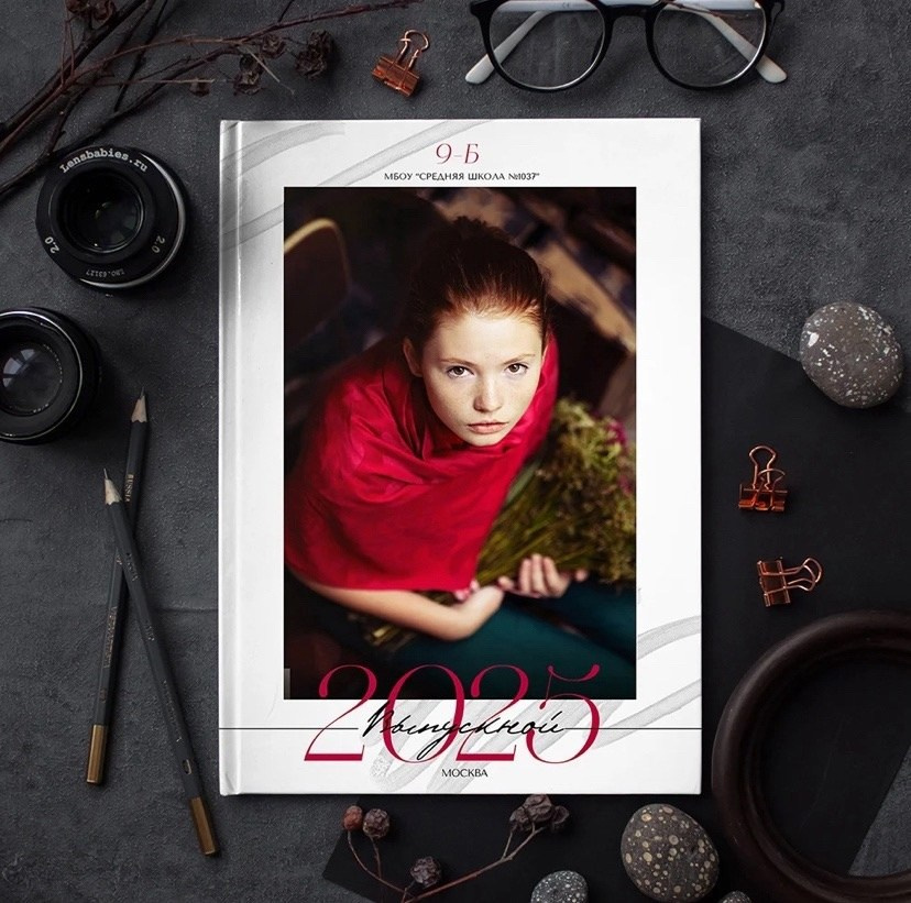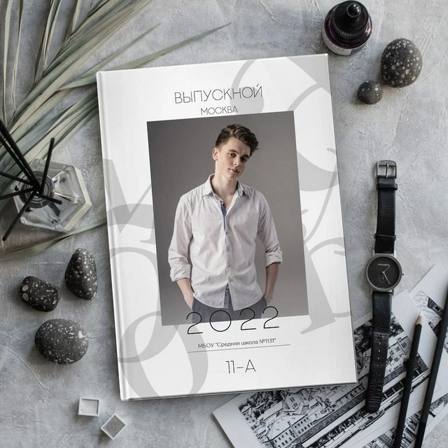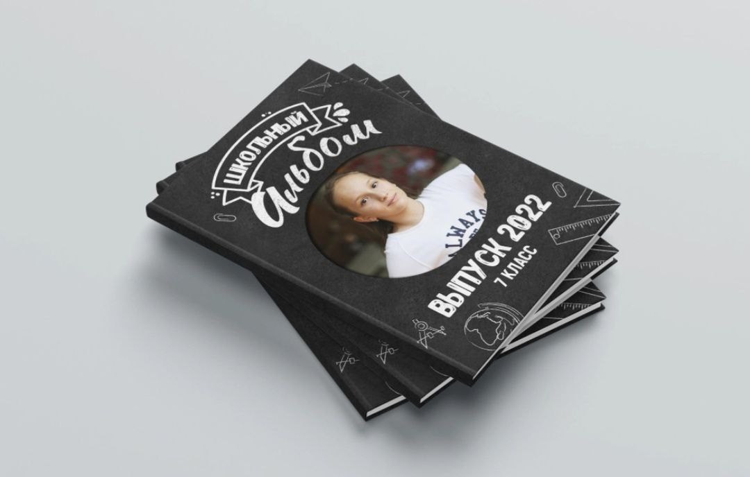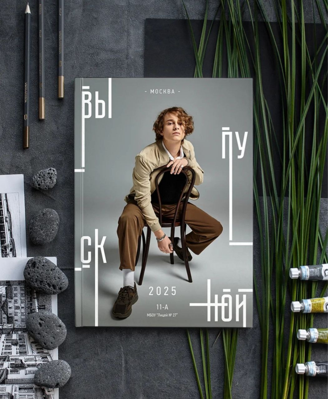 - 2 индивидуальных фото выпускника (одно на виньетке, второе на обложке)