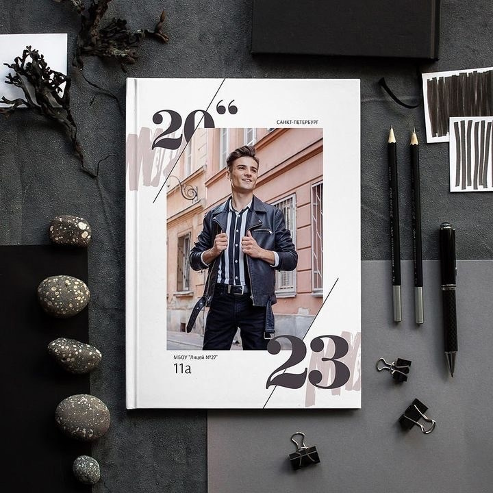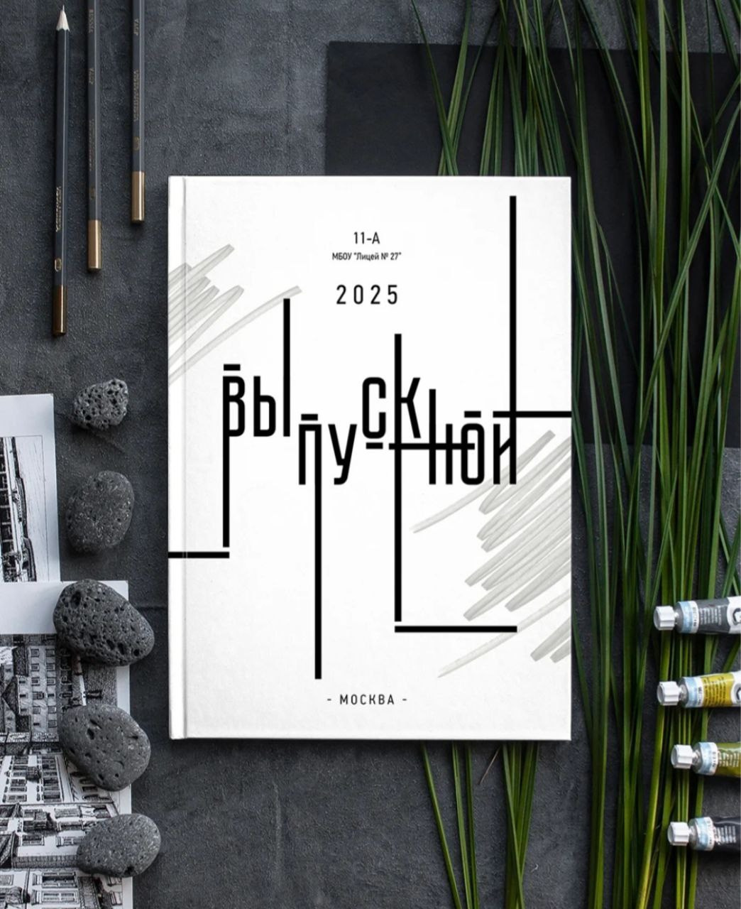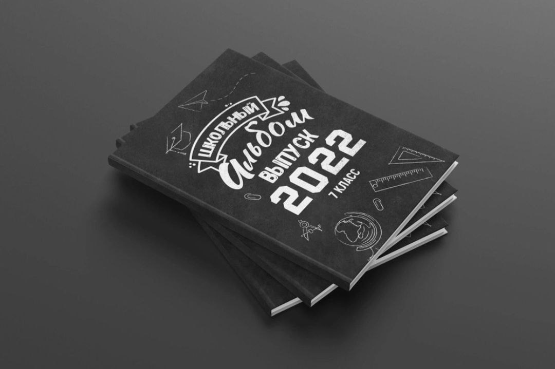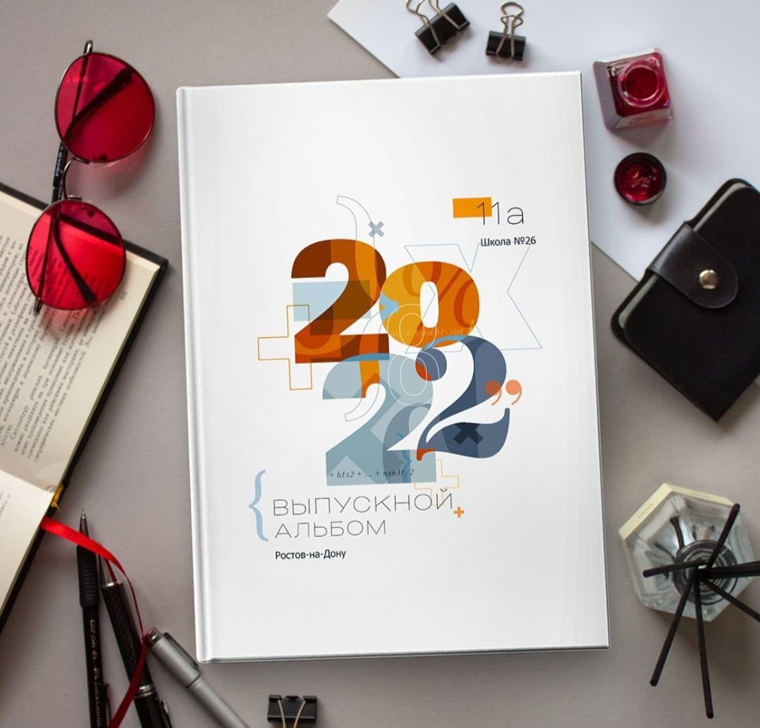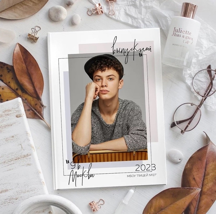 - 2 индивидуальных фото выпускника (одно на виньетке, второе на обложке)