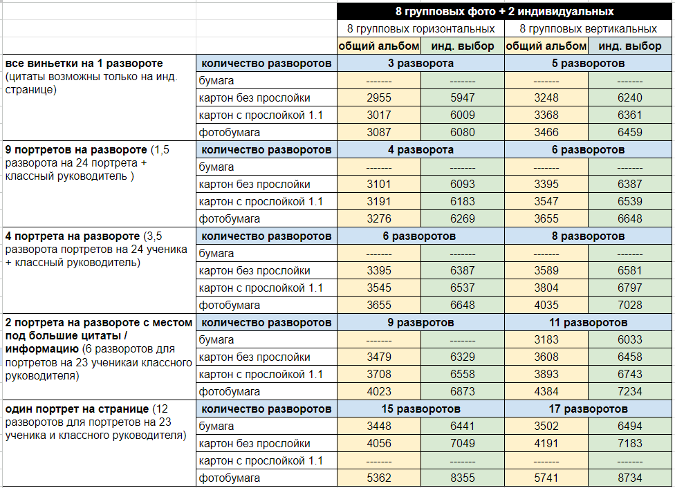 Стоимость альбомов на 8 групповых фотографий (одинаковых у всех или индивидуальных) и 2 личных портрета