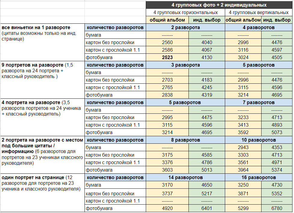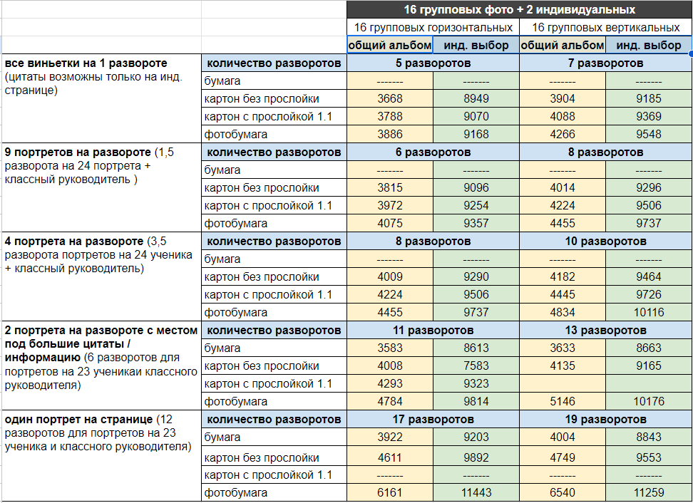 Стоимость альбомов на 16 групповых фотографий (одинаковых у всех или индивидуальных) и 2 личных портрета